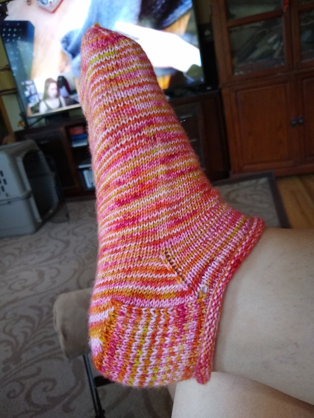 There is something so luxurious about a pair of hand knit socks made exactly for your own foot out of gorgeous yarn. Speaking of yarn, I’m knitting these socks out of my own yarn. It’s my “Tequila Sunrise” colorway on my sparkle base. I might have one skein left in the shop. I need to dye more. I LOVE how it knits up. Stunning!