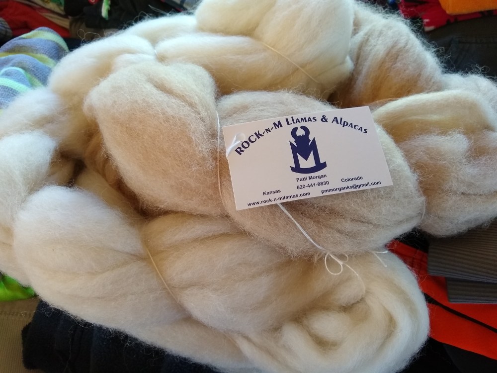 My family went to the local Burro Days Festival in Fairplay, CO this past weekend. I came away with some squishy soft lovely alpaca roving. It’s as soft as it looks in the picture. I haven’t decided if I’m going to spin it alone and go for a nice drapey yarn, or blend it with wool to get some memory into it. I’ll let you know when I decide. 🙂