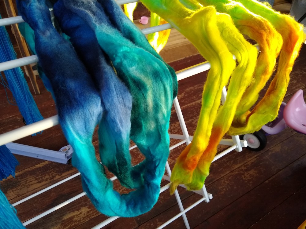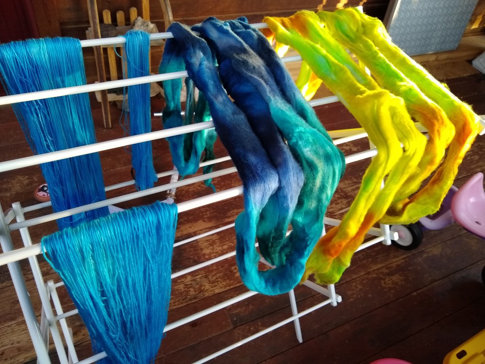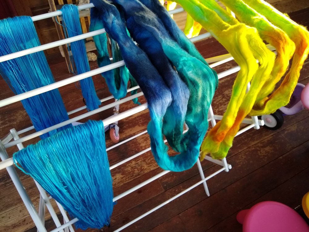 Dyeing, Spinning & Fiber Today’s Dye Fun Posted by Strawberry Hill Fiber Studio on September 11, 2019September 24, 2019 This picture doesn’t do these colors justice. Today’s fiber is stunning, especially the blue. I had leftover dye so I used a few skeins MCN to soak it up and ended up with some gorgeous OOAK skeins(They’re stilldry Share this: Click to share on X (Opens in new window) X Click to share on Facebook (Opens in new window) Facebook Like Loading...