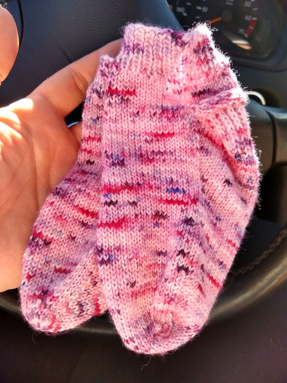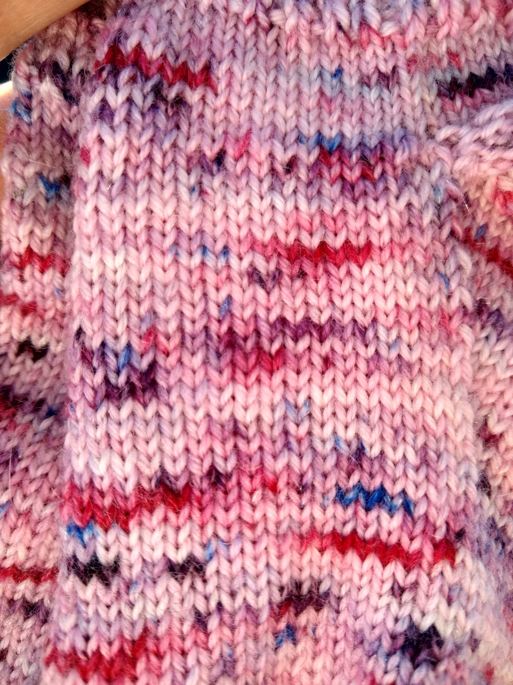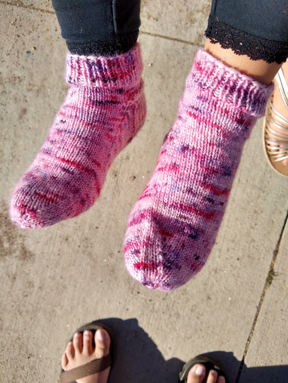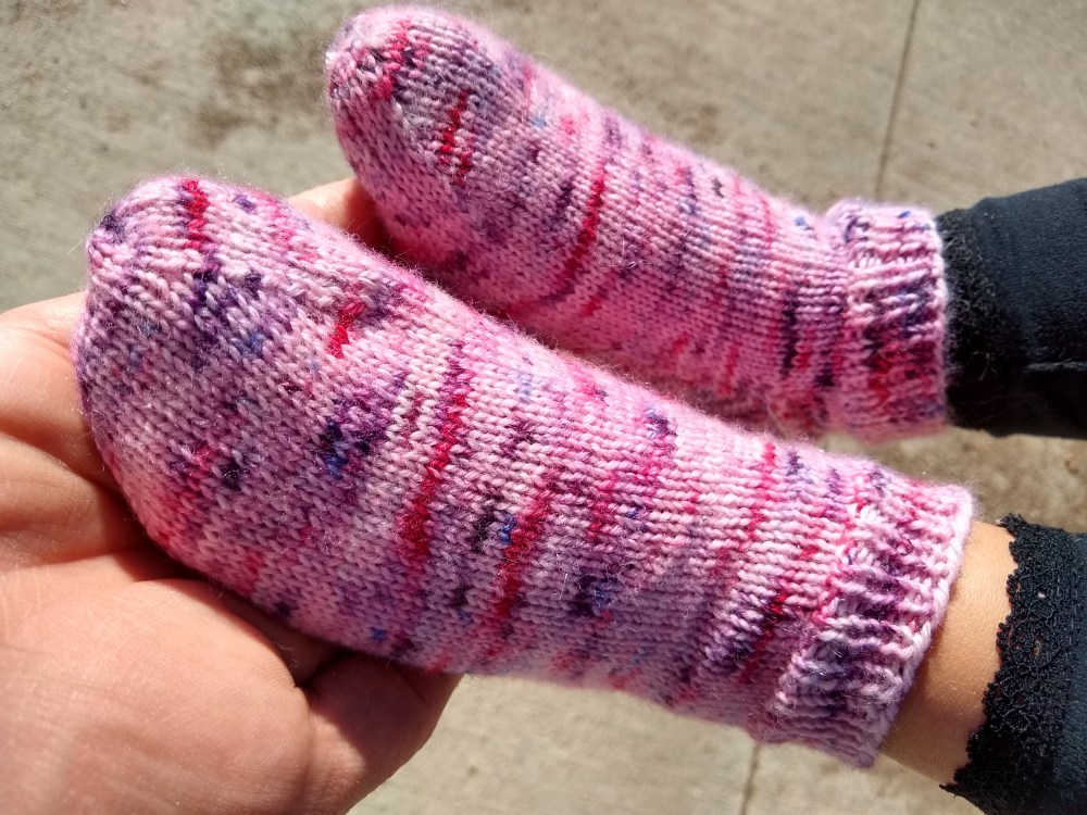 She calls them her sparkly socks because they’re dyed on my glimmer base. I realized after I took this picture that her sock was on crooked. It was super sunny and I just didn’t see it. Oh well, at least the socks from my Bouquet colorway are finally finished! She hasn’t taken them off since. My oldest daughter is requesting an identical pair next. She’s lucky I snagged the last skein of Bouquet from the shop. I may need a short sock break first however (I’ve got a shawl and a poncho on the needles already). I love how this colorway knits up. I need to dye some more and get it back in the shop!