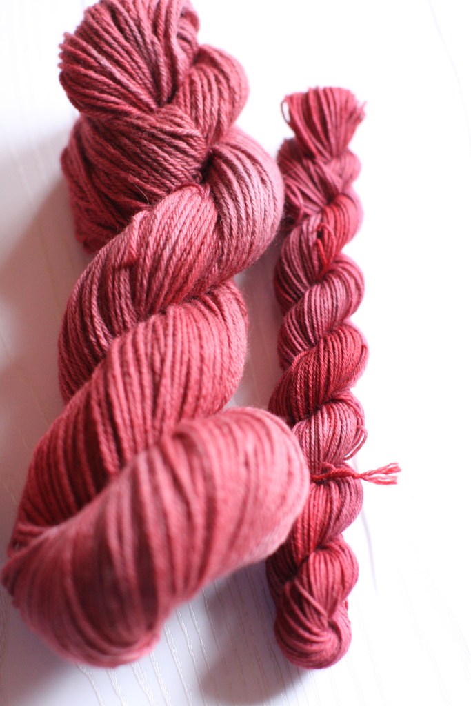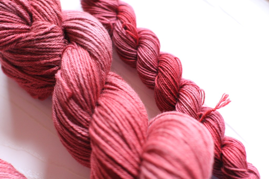 Superwash wool and non-superwash wool take dye in very different ways. The picture above is my “Snow Apple” colorway. It’s a myriad of crimson hues in one skein. The bigger DK weight skein on the left is 80% non-superwash merino wool and 20% cashmere. The fingering weight skein on the right is 75% superwash wool and 25% nylon. You can clearly see that the superwash skein has taken the dye more vibrantly. The colors are much more saturated in the superwash skein.