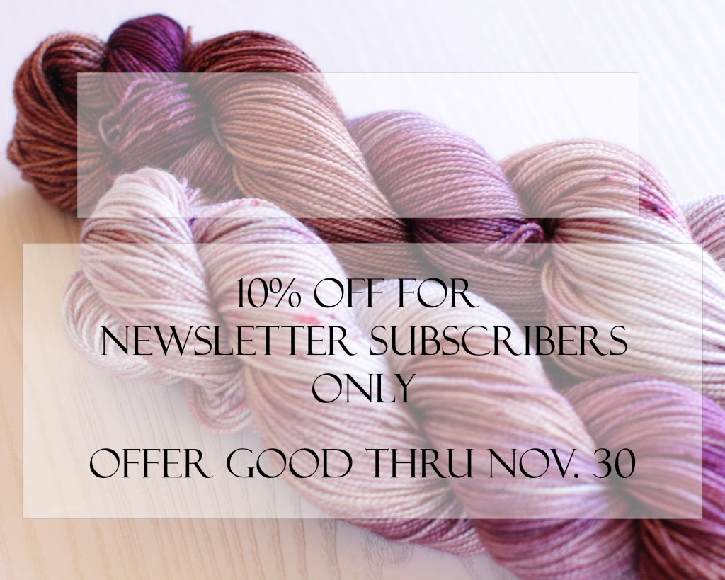If you’re a newsletter subscriber – check your inbox. October’s newsletter has gone out with a coupon code JUST FOR YOU. And remember, Etsy allows coupon codes to be combined. If you have more than one code, use it! The newsletter coupon code is only good through the end of November. Then you’ll get a new one as well as advanced insight into shop updates, new colorways and everything new and fun coming down the studio pipe.