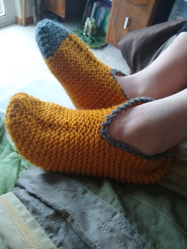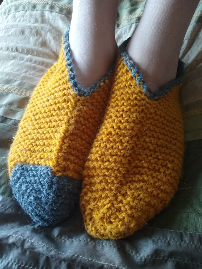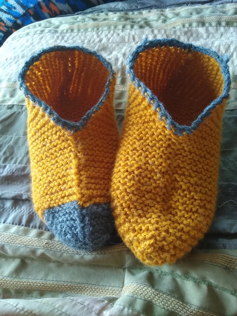 I made a super simple garter slipper today. Size 8 needles, worsted weight yarn, 100% wool. (Don’t look at my loose ends, I’ll sew them in later). I think I may crochet around the ankle for added support. Nothing special, but it is my first ever slipper. Once I get good at making these I could see this being a great stash buster/Christmas gift knit.