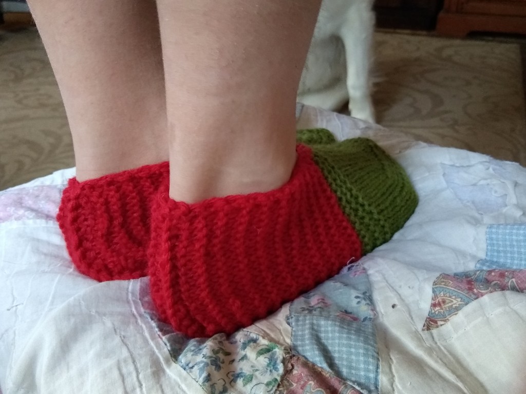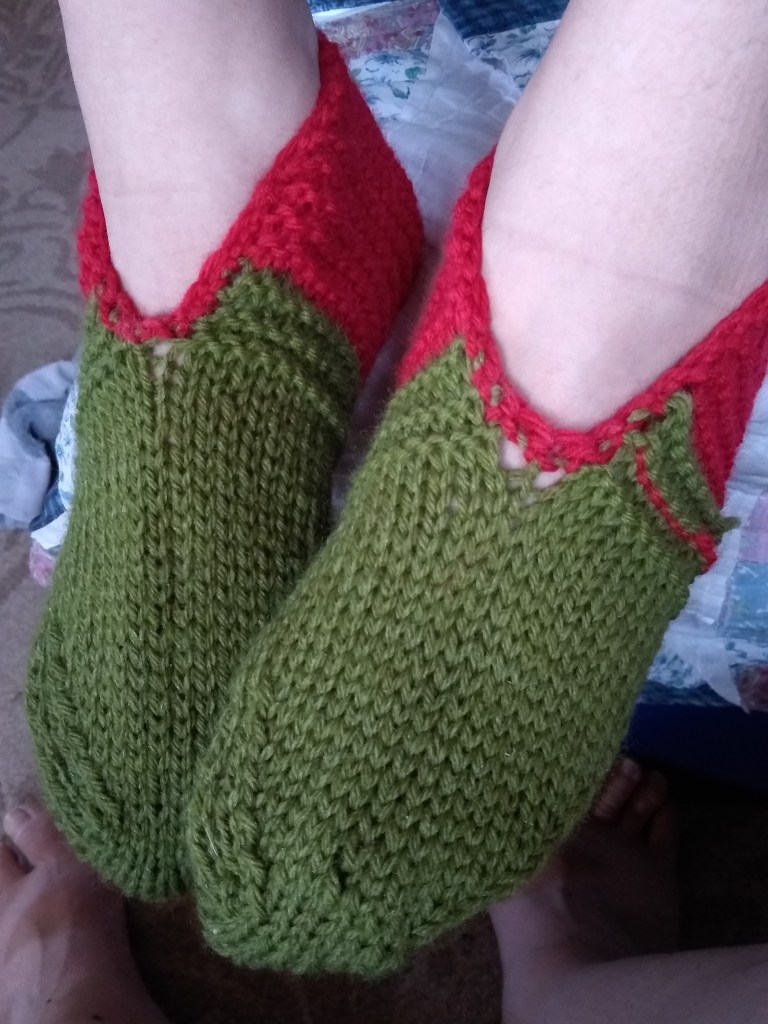 Edited to add: you can see a spot on one side with red yarn in green stitches. I knit in my ends while stitching these so there was only one end to weave in when I was finished + the tail from the crochet edging. I hate weaving in ends, and they’re house slippers.